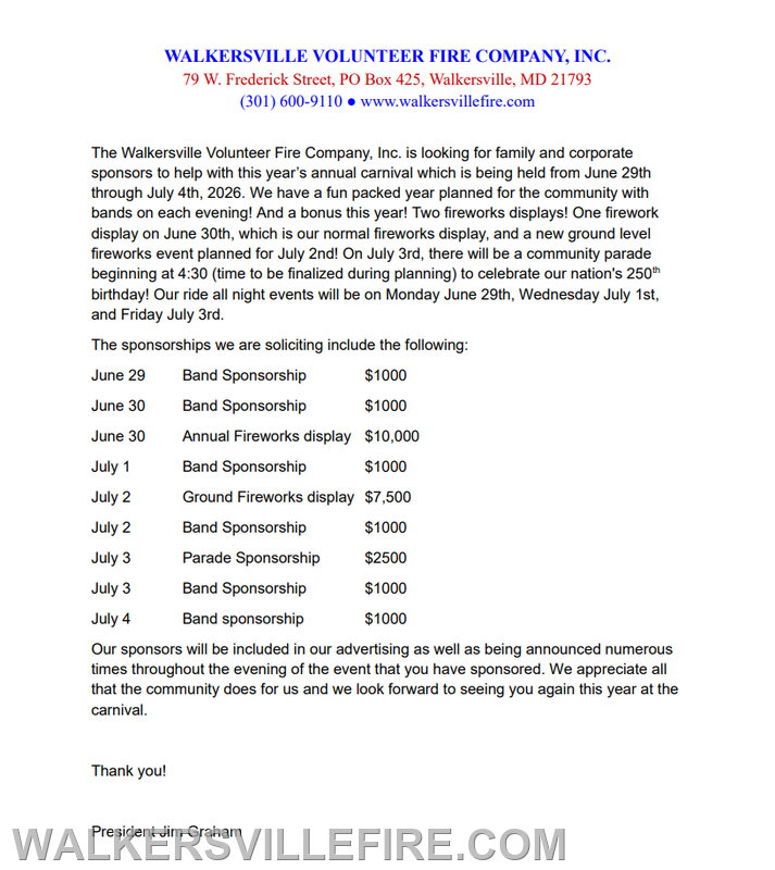 Are you looking for a way to get your business advertised at a large event? Are you looking to support a community non-profit organization? Look no further! Carnival Sponsorships are available! Contact us today at: info@walkersvillefire.com